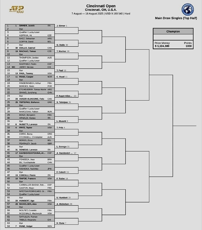 我们再来关注其它赛事。北京时间昨晚,ATP辛辛那提大师赛公布了男单正赛签表。世界前二辛纳、阿尔卡拉斯领衔出战,前八大种子的对位:上半区,辛纳--穆塞蒂、弗里茨--鲁内;下半区,谢尔顿--兹维列夫、德米纳尔--阿尔卡拉斯。